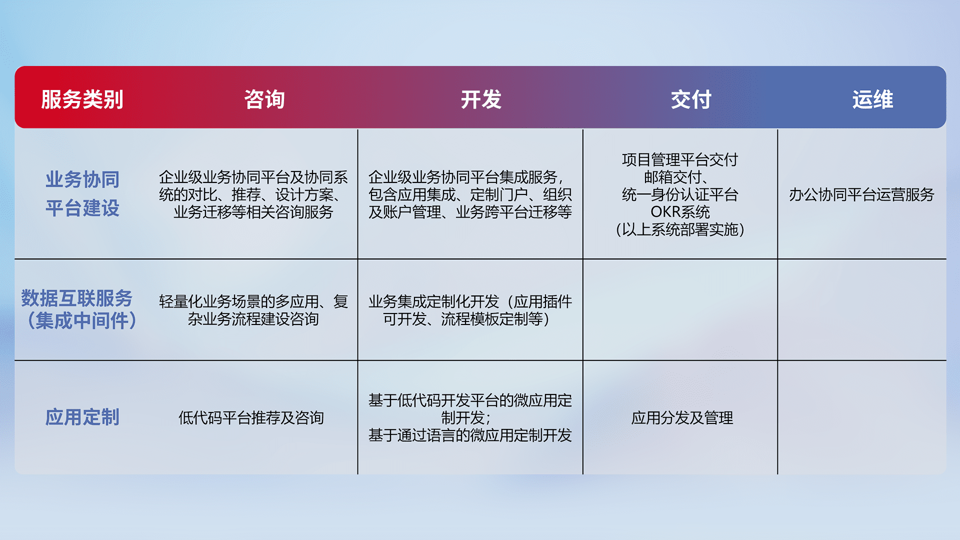 针对钉钉、、企微、、、、IDaas等平台级产品提供产品的规划、、、、方案、、、交付、、定制化开发等服务,,实现如统一协同办公、、、智能客户服务、、、、混合会议管理、、、、智能数据查询、、等业务场景,,,实现数字化转型。。。。